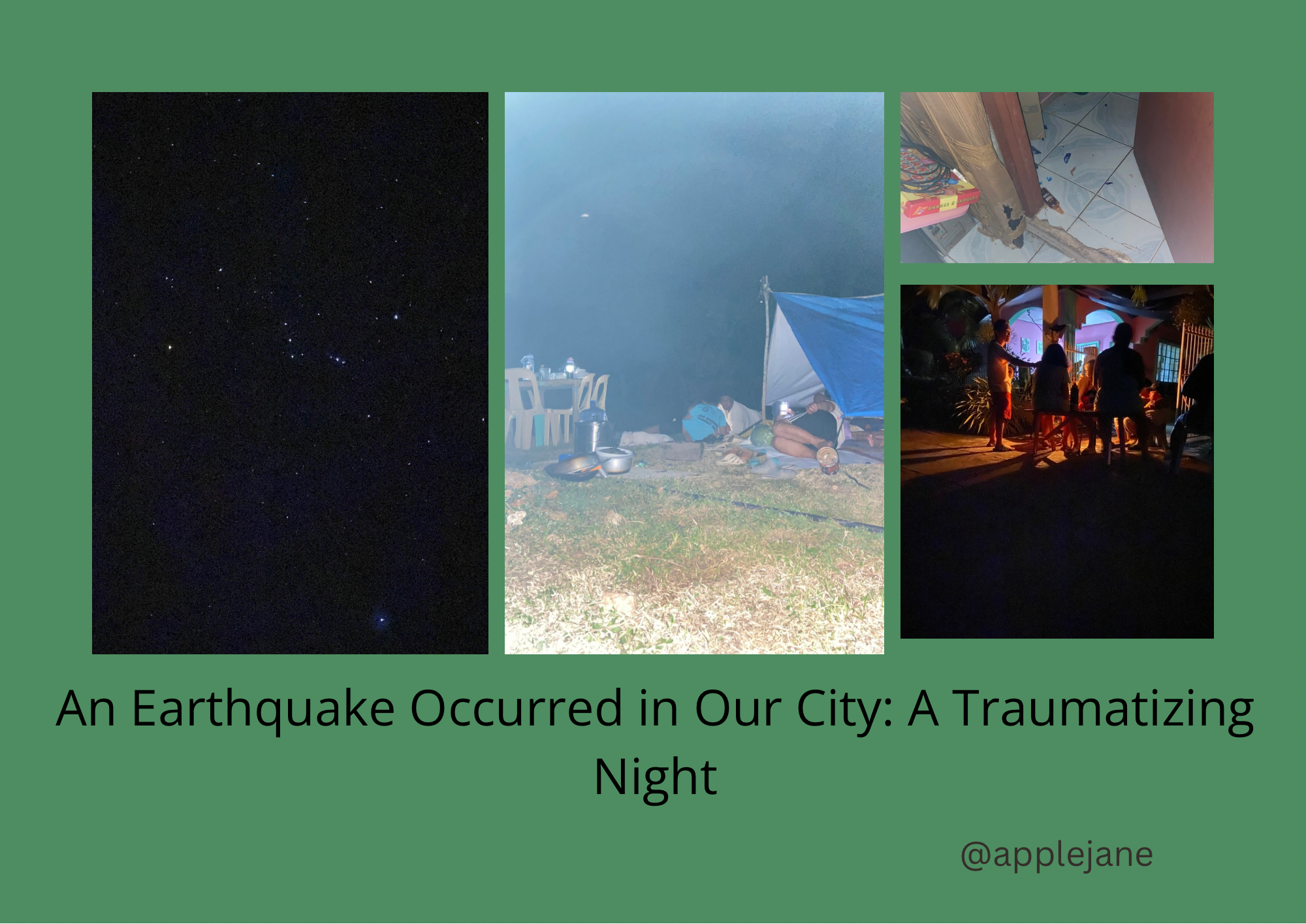 It was momentary. Yet, it can lead us to death. My mom and I then ran to the outside after the quake and I only think of her at that time. And I forgot to bring my dog, he was inside the house. I then ran back to the house and I thought I lost him because he’s nowhere to be found. But luckily, I found him below to my bed. He was scared and traumatized. I will always remember this traumatic event that happened.
