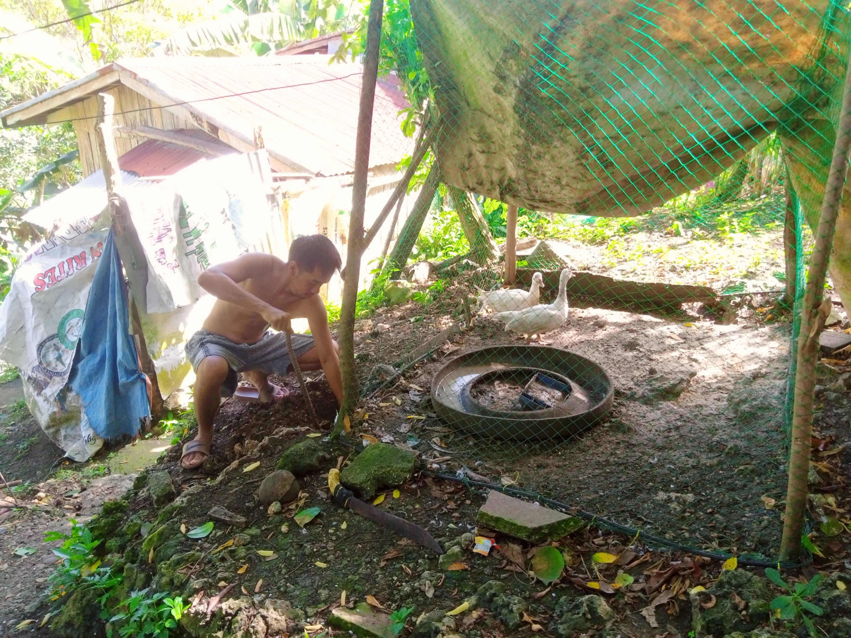 Now, the problem is that my father who is daily feeding the ducks cannot clean the food tray and the bathing-wheel since the fence is 7-feet high. Thus, cleaning is due twice a month only. The inside floor space is smelly and the ducks are dirty. The roofing has lots of chicken manure since the coop is placed under a Mansinitos tree which is the perch for chickens every night.