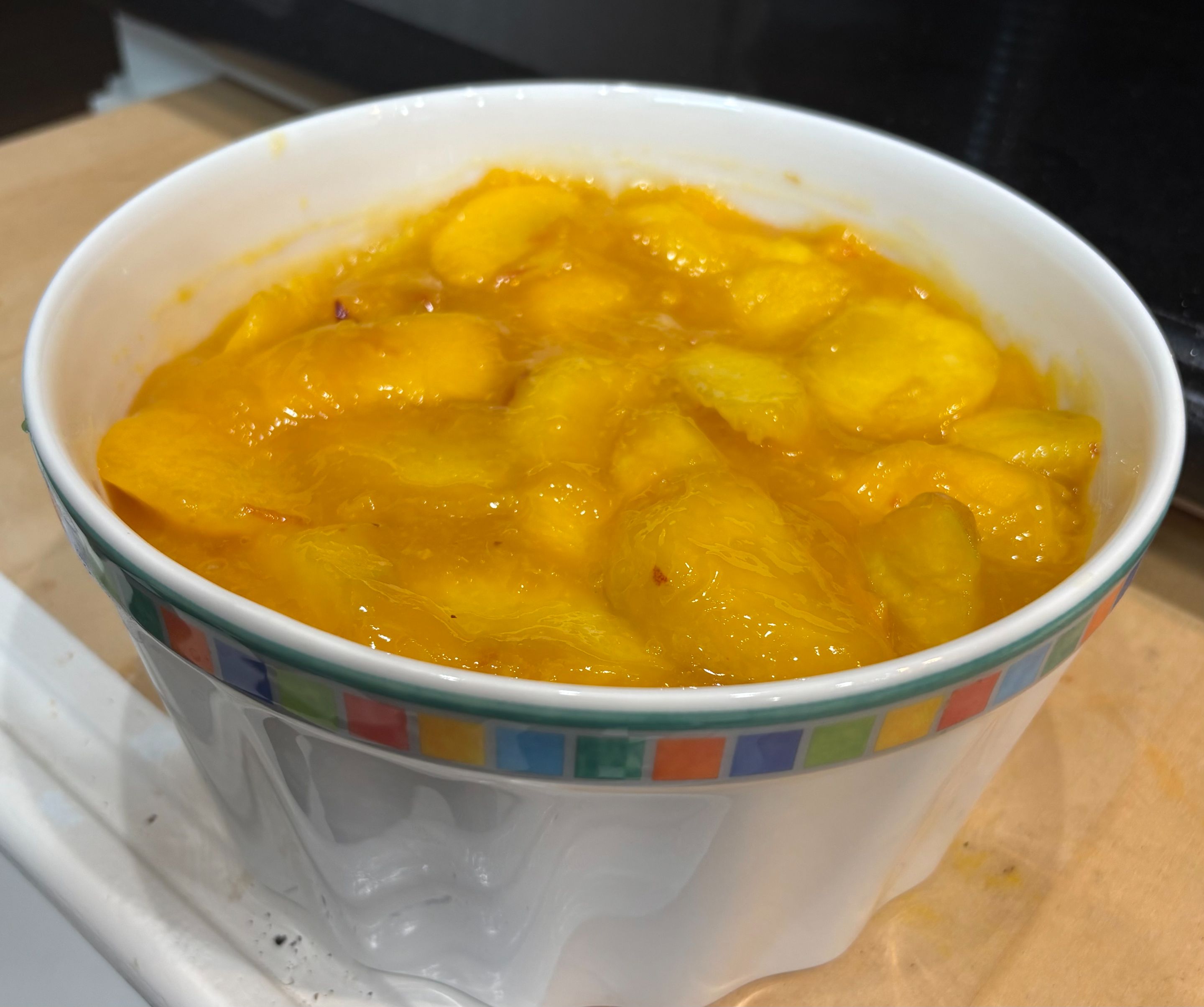 The blend went into a pot, where it simmered while being stirred into a lovely glaze. Lemon juice was added, followed by the nice-sized peach slices.
