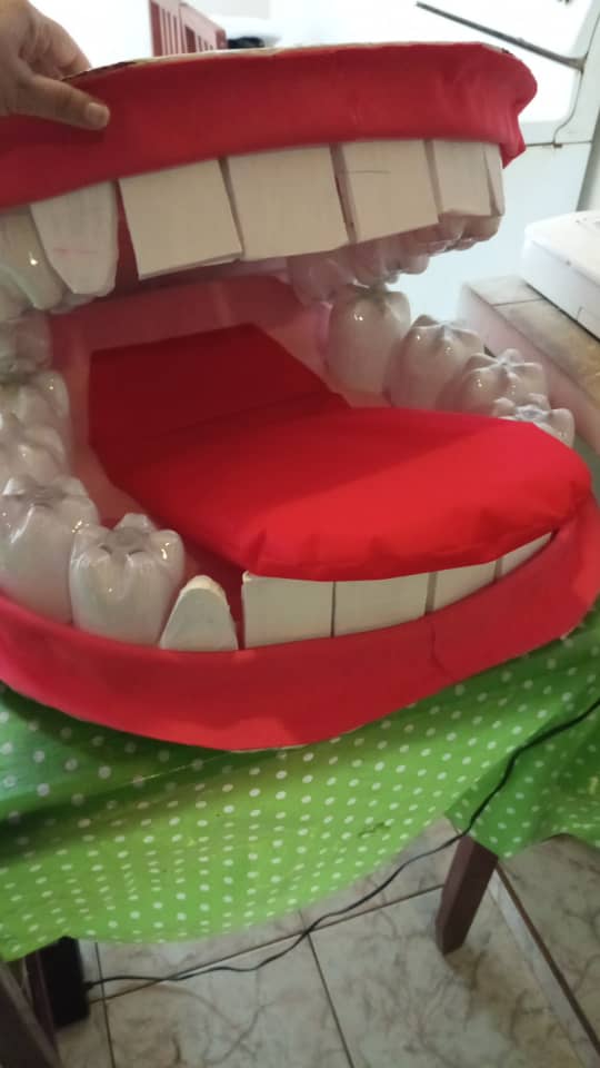 Well, I will tell you that after seeing the thousand and one ways to make a giant size model to represent the mouth, I looked for the following materials: cardboard box, paper and white glue, paper, plastic bottles of soda 2liters and liter and a half, anime, white cold paint, red foami, red POP cloth and flesh color (in some places they call it surgical fabric), silicone stick, foam rubber or padding (for the tongue), silicone gun, scissors and willingness to work.