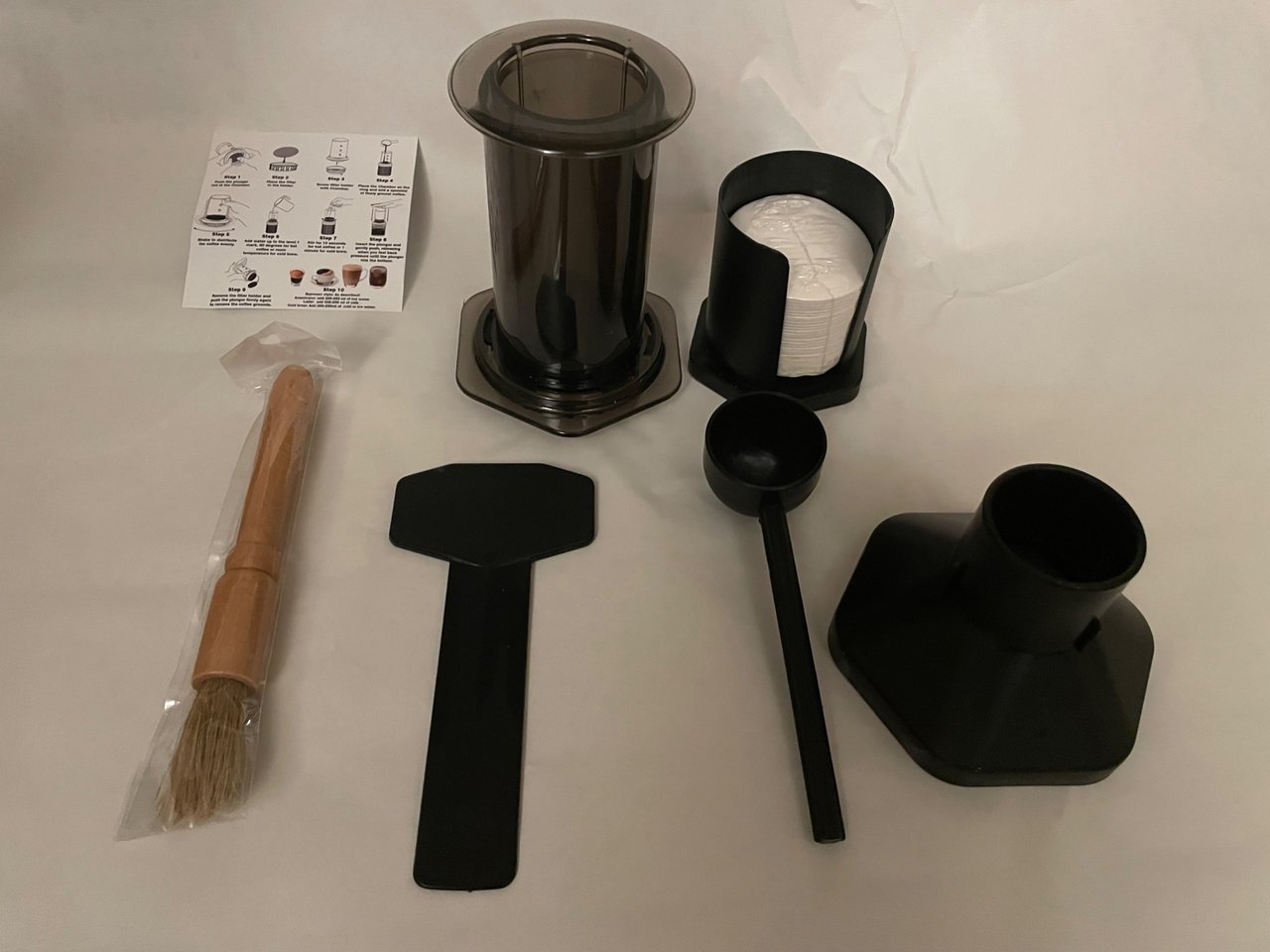 There is a lot in the box like cleaning brushes, paddles to mix things up and a funnel so that the coffee doesn’t go everywhere.