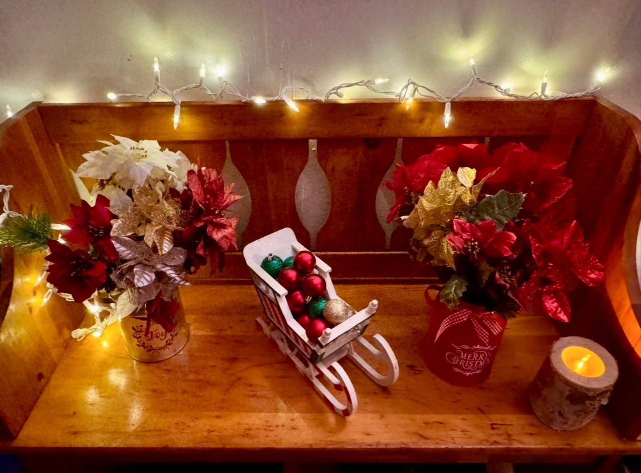 So back to the tree; it took a bit for me to get things just as I like them but I did get it done. I also pulled out some seasonal picks and decorated the deacon’s bench.