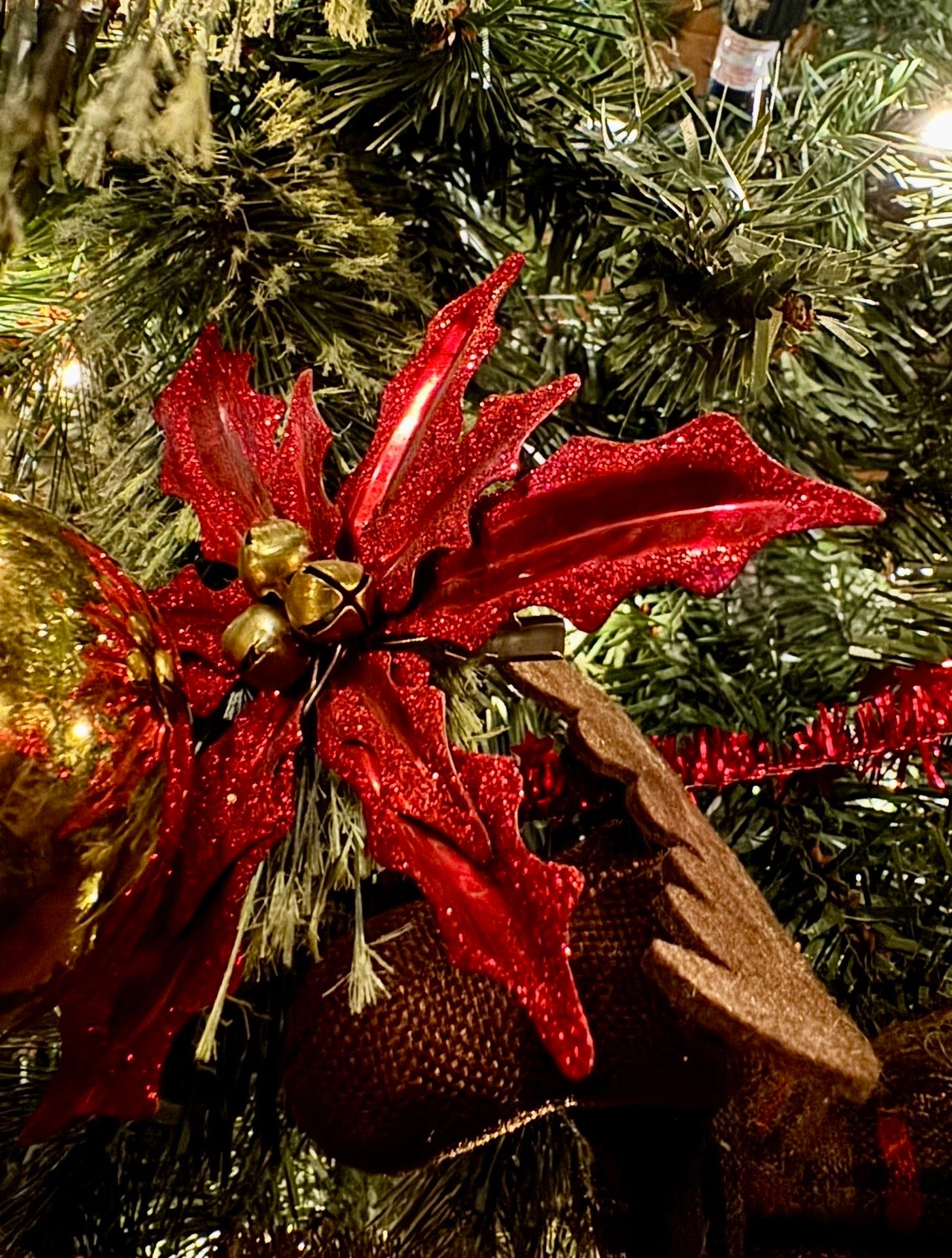 See the reindeer just sneaking in under the poinsettia as if he’s going to eat it?