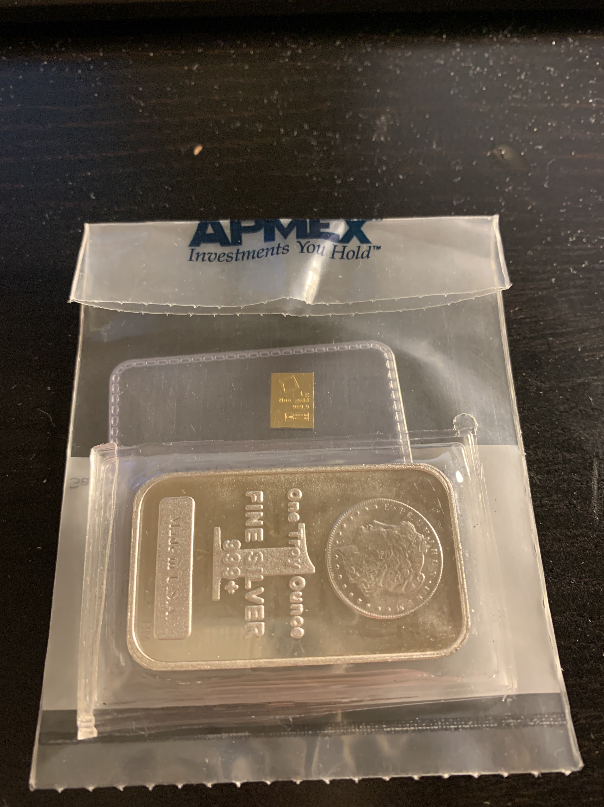 Here's a picture for some context. That is 1 gram of gold over 1 ounce of silver. Based on the price at the time of writing, it costs $84.41 for the gold and $35.04 for the silver.