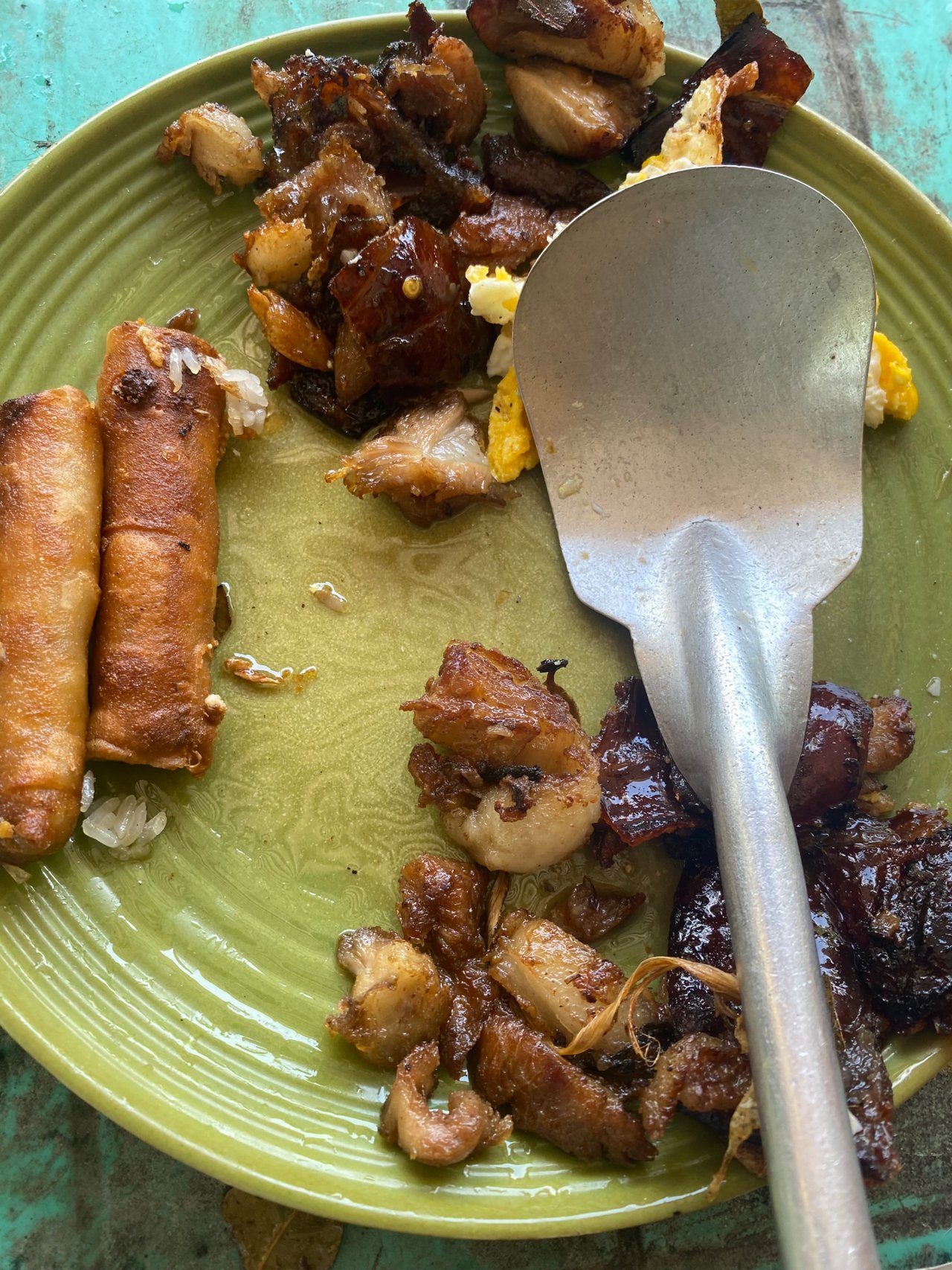 First, I fried the egg and the pork to make the water spinach tasty. The pork that I used was our leftover lechon from the fiesta at our place. To make it more yummy, I mixed it with the stir fry spinach.