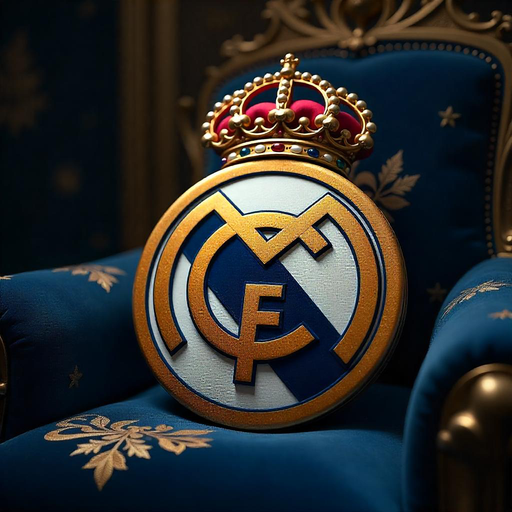 prompt: The Real Madrid shield, with the crown replaced by a regal golden crown, displayed on a velvet cushion in a royal treasury, illuminated by soft light, detailed gold embroidery, royal blue velvet, ornate background.
