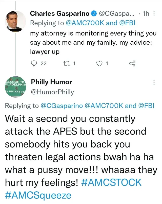 has been very vocal about his distaste for AMC Entertainment, and the so called "ape movement" behind the stock rally. He has belittled, annoyed, and appeared to do his very best to ruin the imagine of both AMC, and the "ape movement". Lately, it has become worse.Charles Gasparino has upped his game, attacking AMC apes as much as possible, in an attempt to, what we believe, cause drama. This has worked, and the so called AMC ape movement has responded in force. However, instead of giving Charles the attention he likely wanted, it has blown up in his face, in the worst way possible. He is being attacked, by truth.