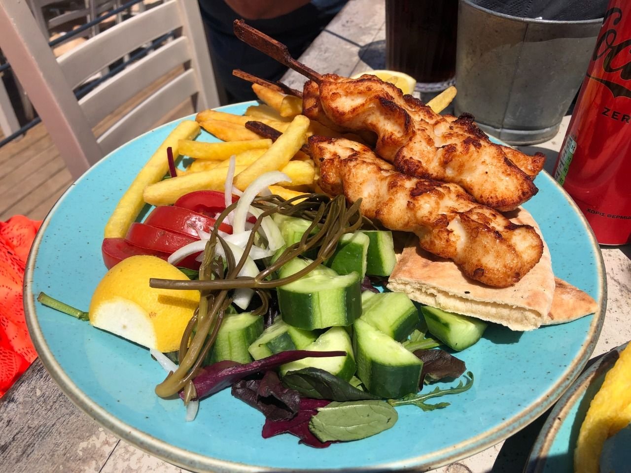 My mom ordered a chicken burger for lunch which came with chips and a salad. Kiara and I ordered chicken skewers which came with chips and a side salad as well as some pita bread.