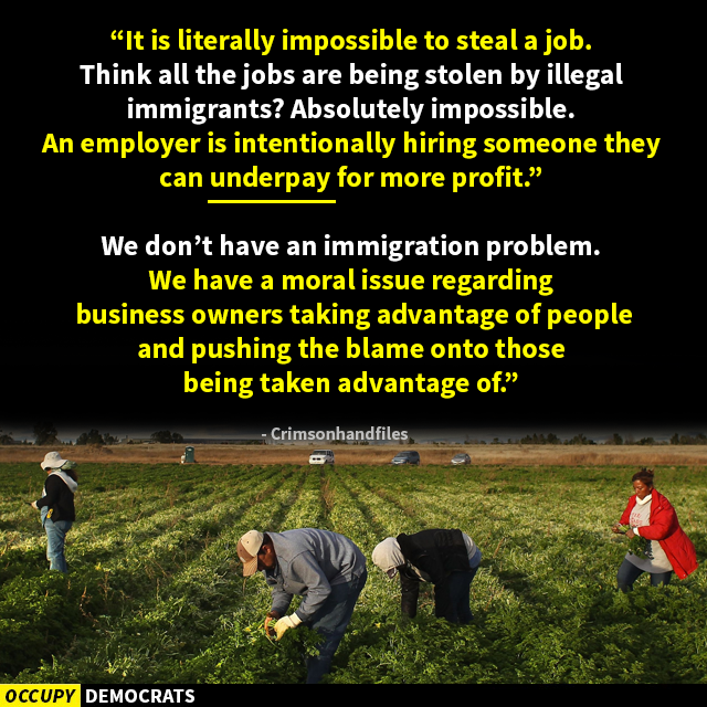 Either way, the underlying premise is that somebody is cheating you out of a job, and somehow it involves employers and immigrants colluding against the native-born American working class.