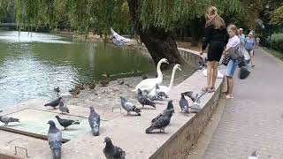 Десятки птахів відчувають себе як вдома. Лебеді, качки, всюдисущі голуби. Люди годують птахів... (Хоч це і заборонено).