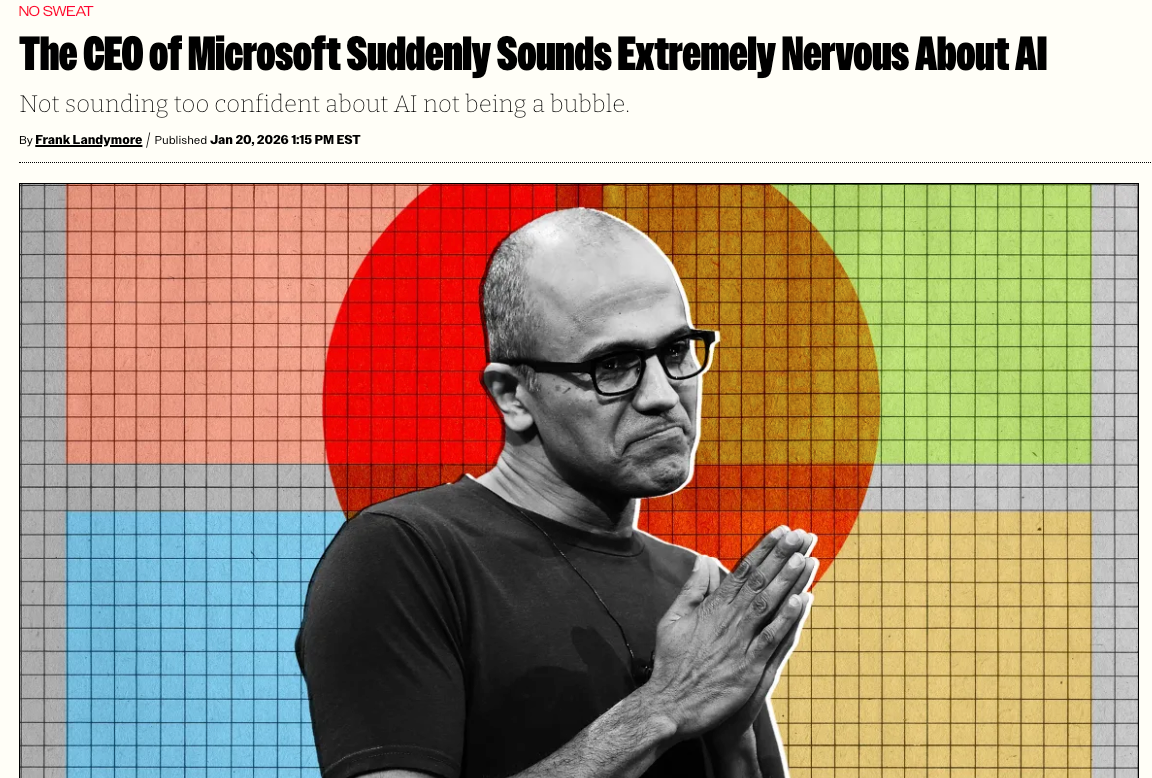 Speaking at the World Economic Forum at Davos, Switzerland on Tuesday, Nadella pontificated about what would constitute such a speculative bubble, and said that the long-term success of AI tech hinges on it being used across a broad range of industries - as well as seeing an uptick in adoption in the developing world where it's not as popular, the Financial Times reports. If AI fails, in other words, it's everyone else's fault for not using it.