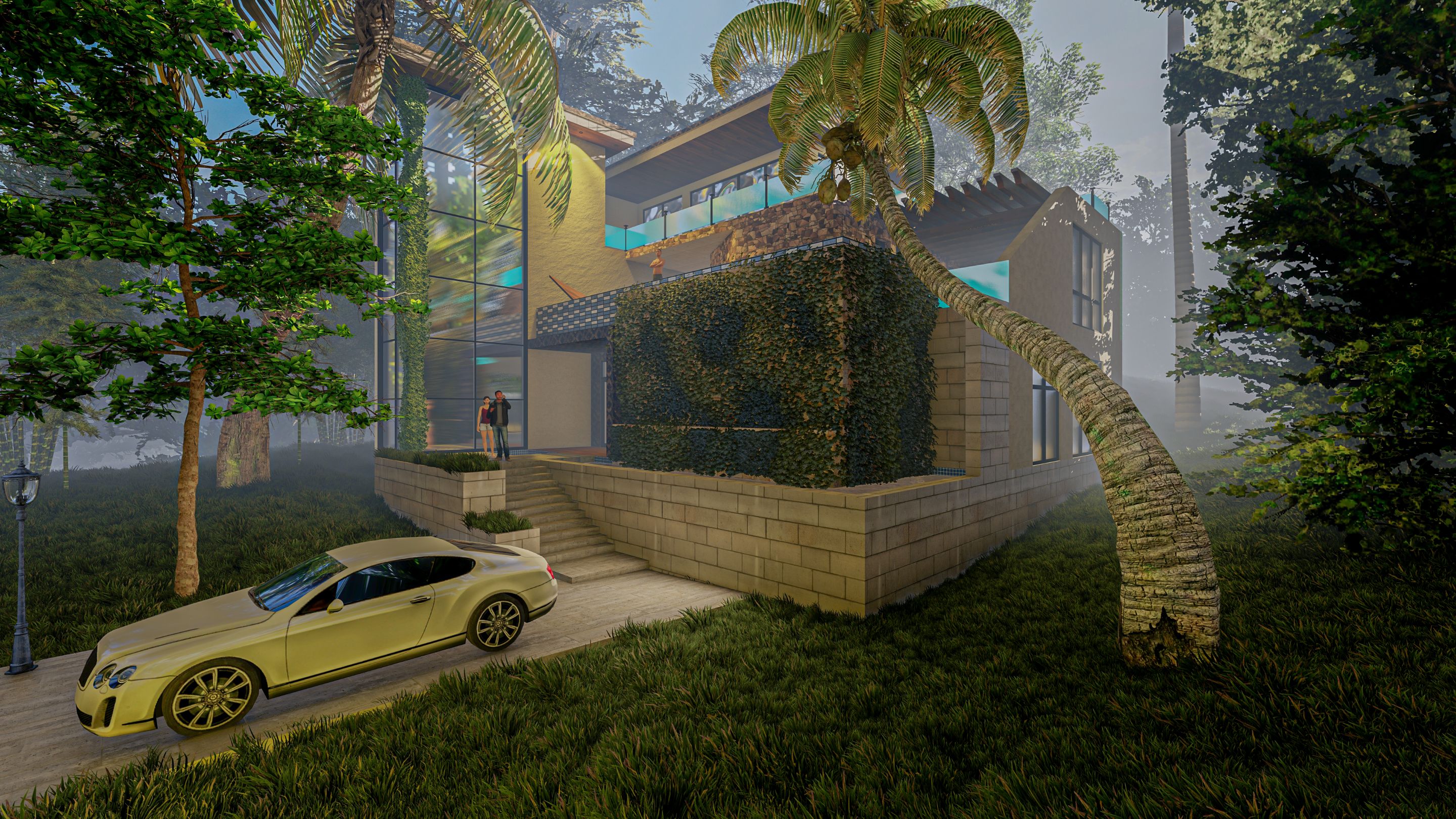 I tried to give it a bungalow house look. To put it more clearly, bungalow house is built with a very large common area, the house is designed for common self-use, to express one's choice, to express nobility and there are plants around. It is used for general personal or family leisure activities.