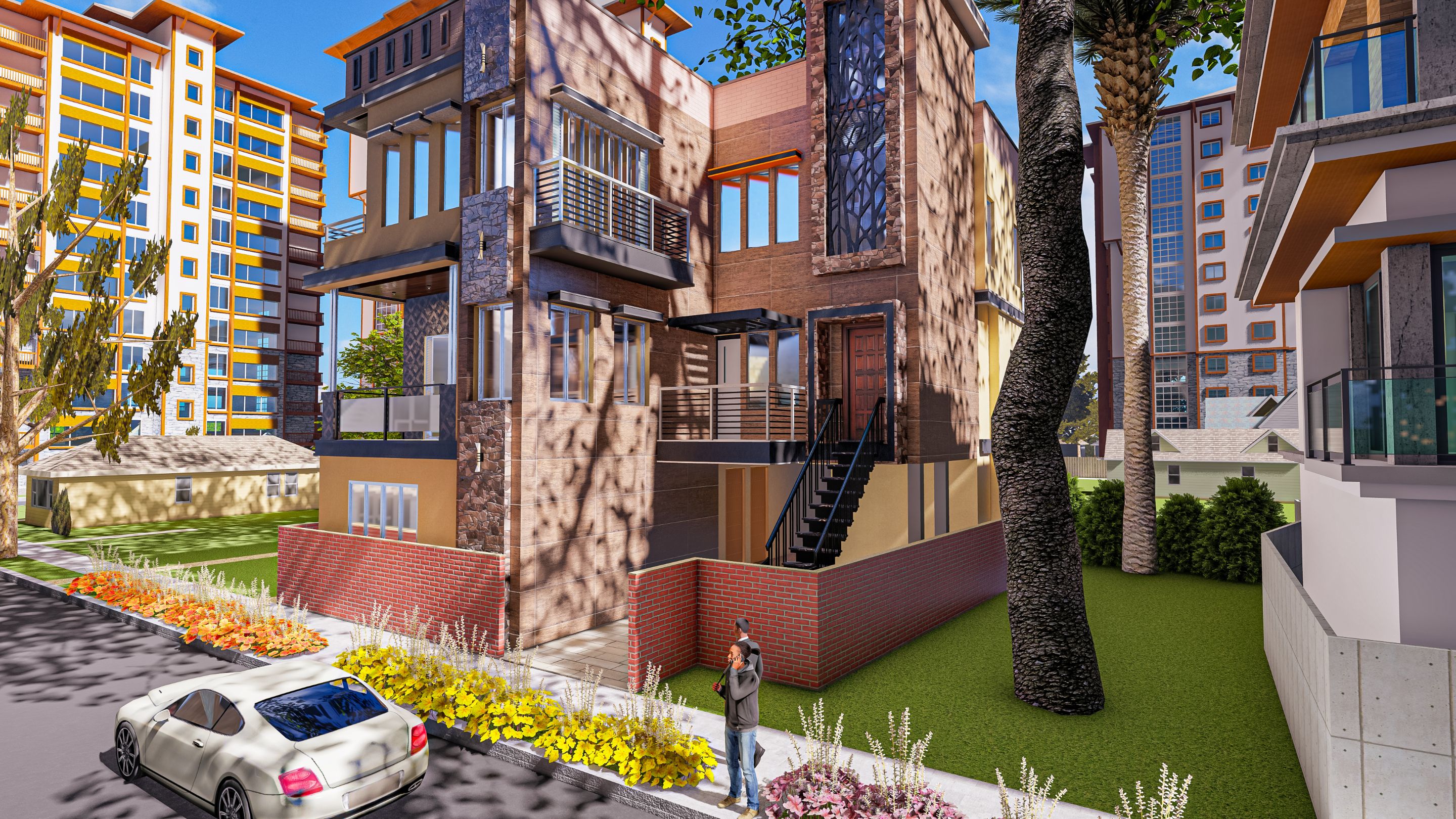 I am currently working on Lumion for rendering. It is also rendered with Lumion. I have used many textures in the design like full tiles in the entrance area, full cream color on the right side and black and cream color on the left side. The left side looks more beautiful than the other side. Also there are two balconies where I have used wood texture as well. Here, I then placed it next to my previous design. As for the previous design, I put it right next to the house design that I showed in my previous post. It doesn't require me to design a new environment for it separately. However, the render results are right in front of you. Looks pretty good to me. Let me know what you think of this design.