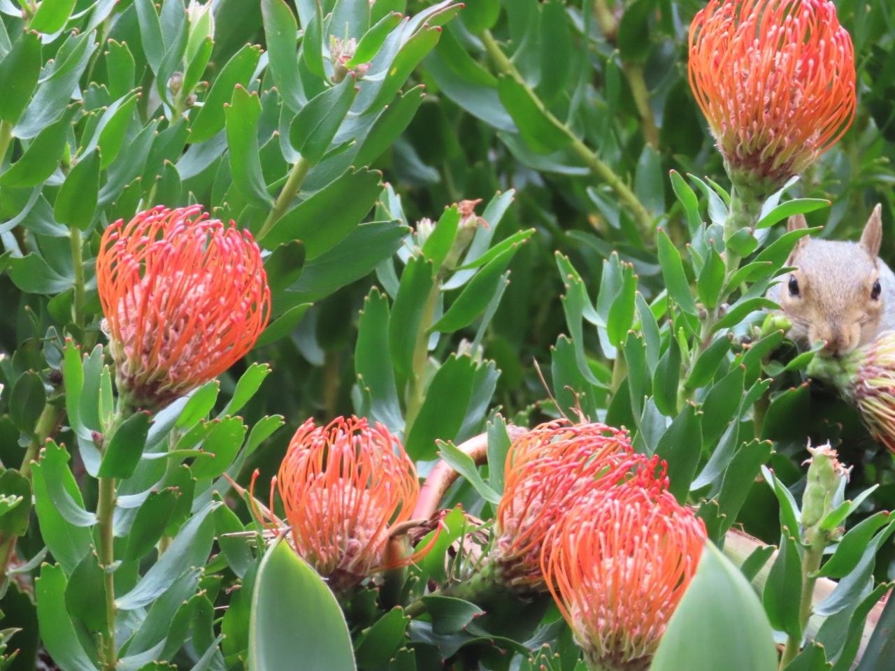But he didn't mind, as he just continued to have his snack and he knew that he was beyond our reach. So, yes, I can tell you that squirrels eat the protea pincushion flowers. Mind you, they don't eat the whole flower as they leave the petals, and they eat the base of the pincushion flower.