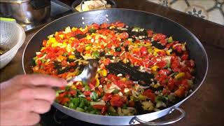 - Drizzle a generous amount of Gallo Clássico Extra Virgem Olive Oil over the vegetables in the paella pan