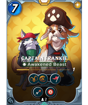 With a 7 mana cost, Captain Frankie is clearly not an Archon for budget battles. This is the kind of leader who sits at the big table. Ideally, it’s used in 30+ mana battles. You can force it at 27 mana, but that’s like going to war with barely enough supplies—you might win, or you might come home with your head down.