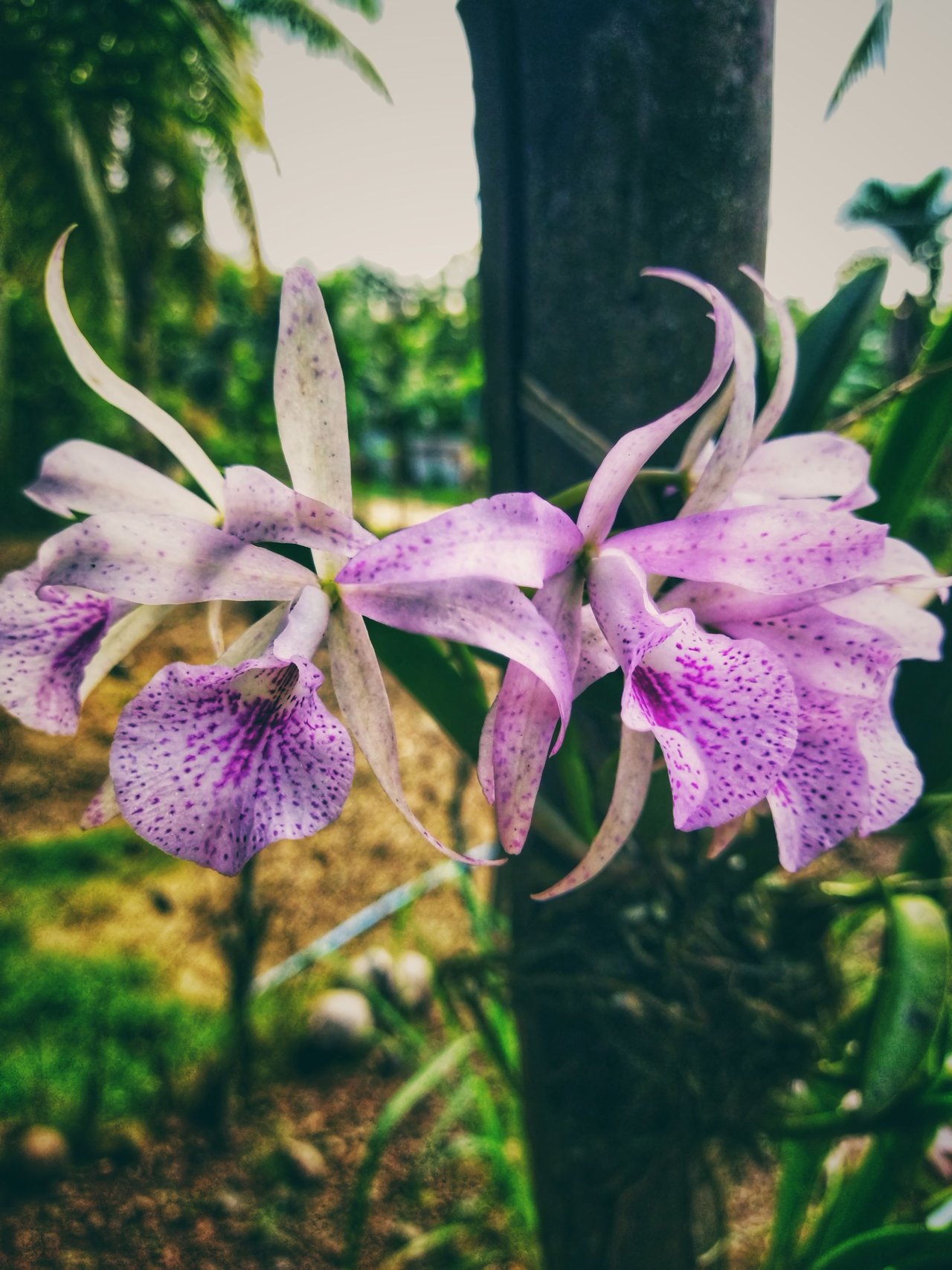 I have some lovely purple-spotted ones (likely Cattleya or a similar hybrid) climbing on a pole that look so elegant and bright.