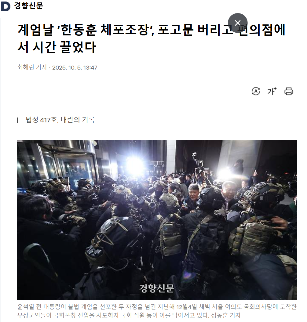 He was not in a hurry when he was packing his handcuffs and rope at the gym. He dragged his feet as long as he could by talking with Major Shin Dong-gul, who was designated as the commander of Lee Jae-myung's arrest, saying, "Is this real?" and "Let's not do anything." However, he took his men to the National Assembly following orders from his superiors, who urged him to dispatch. Back then, Choi reportedly feared that if he did not dispatch, he could become a flight attendant. Major Choi said, "Everyone smelled like alcohol" when he headed to the National Assembly as if he was being pushed.