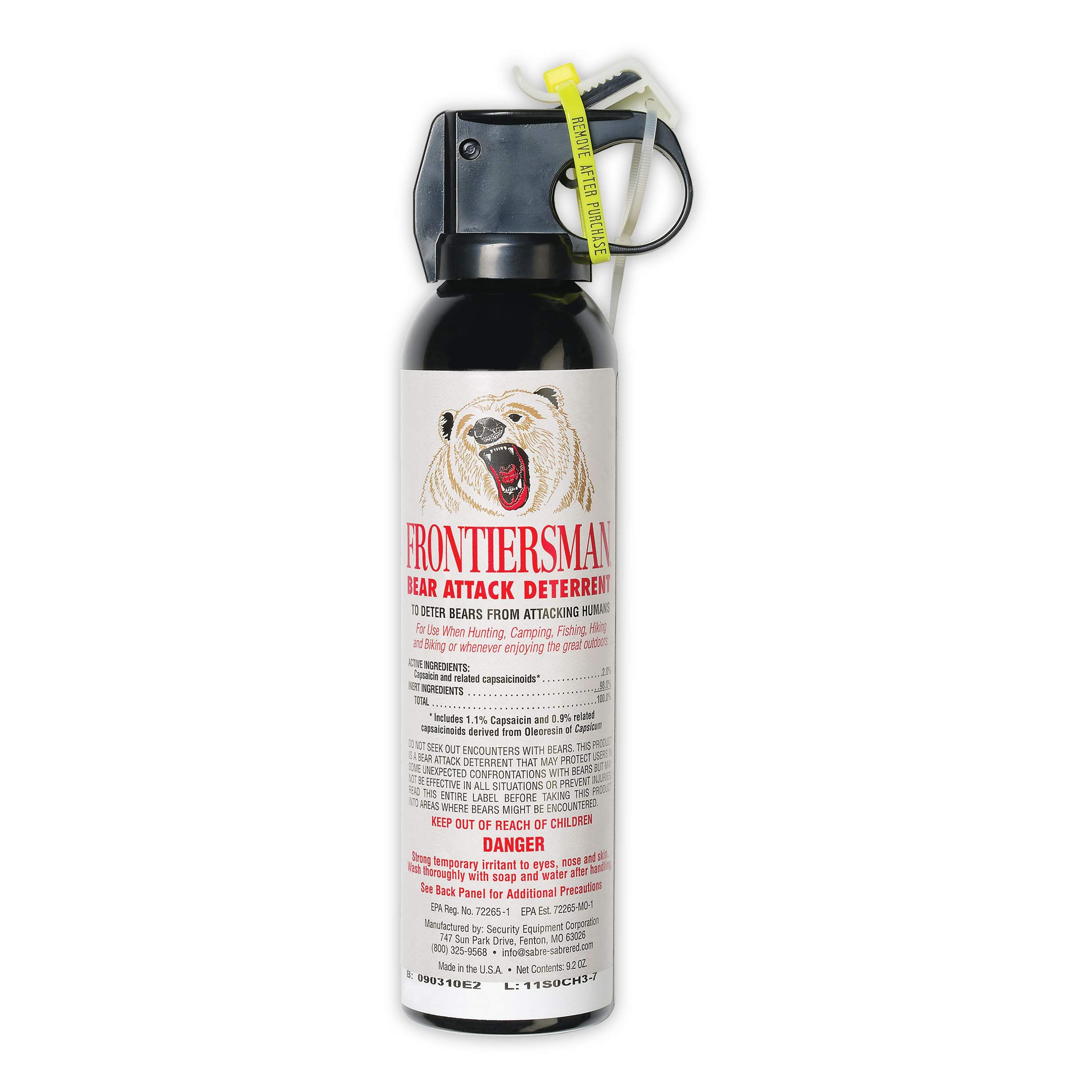 Introducing FRONTIERSMAN Bear Spray 9.2 oz – the ultimate bear defense spray designed to keep you safe in the great outdoors. With a range of up to 35 feet (10.6m) and an impressive spray rate of 52 grams per second, this powerful bear deterrent spray creates an impenetrable barrier for maximum protection. Our proprietary pepper spray formula contains 2.0 major capsaicinoids strength, making it over a third more potent than our leading competitors. Trust in FRONTIERSMAN to provide you with the highest quality bear safety products on the market.