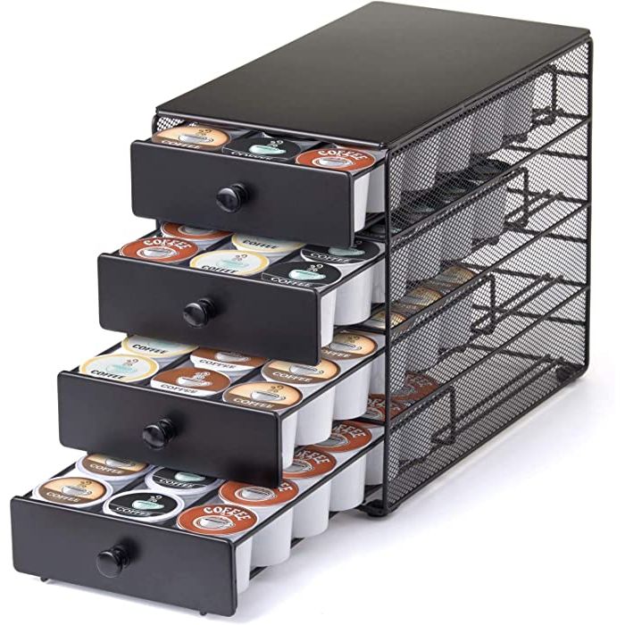 The Nifty Coffee Pod Drawer is a stylish and super-sized storage solution for coffee lovers who use K-Cups. It has a 72 pod pack capacity and a 4-tier holder that can hold up to 18 K-Cups per tier. The rack is compatible with K-Cups and fits seamlessly under your coffee maker, making it the perfect organizer for your home or office kitchen counter.