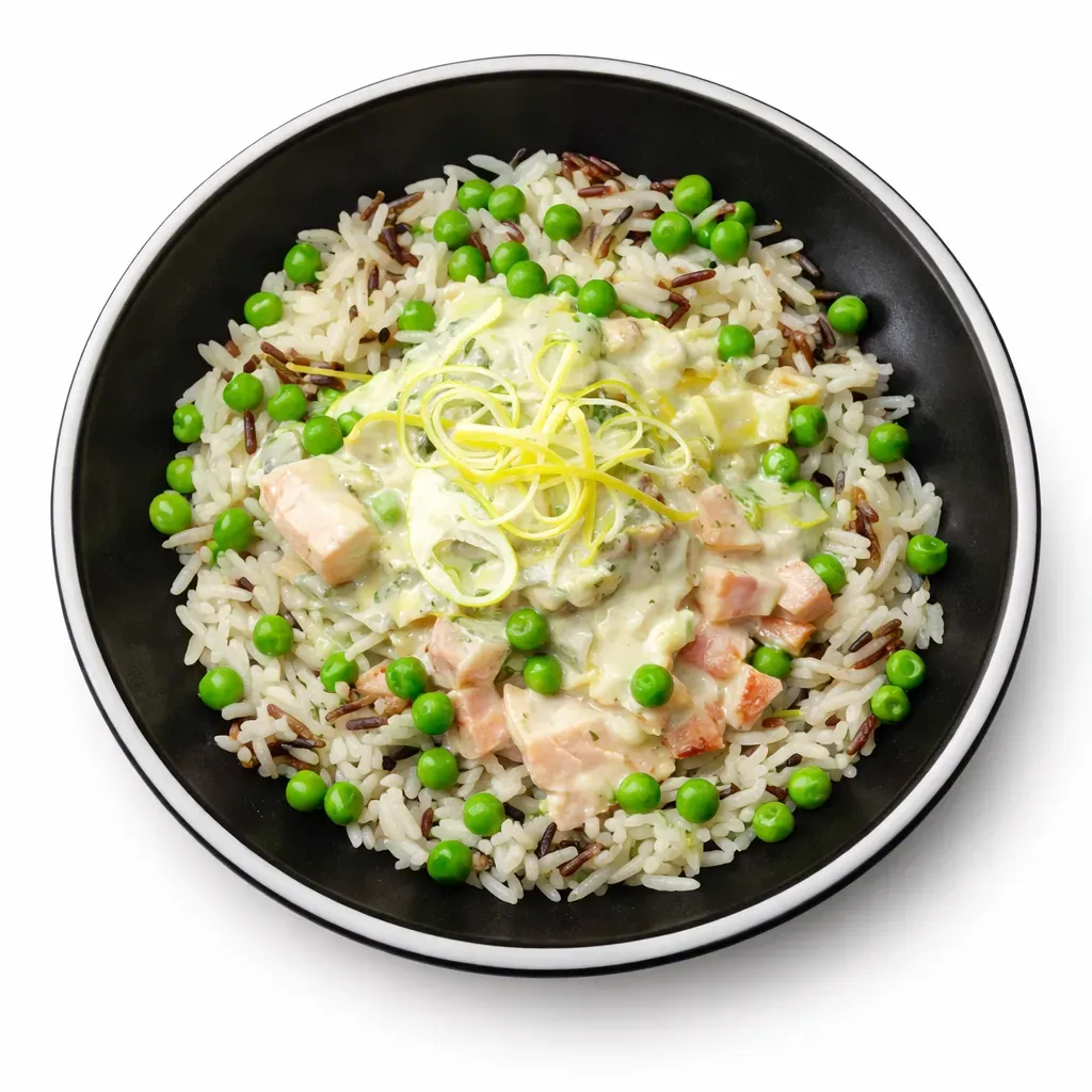 - Top with cooked peas and garnish with additional lemon zest and finely sliced leek if desired.