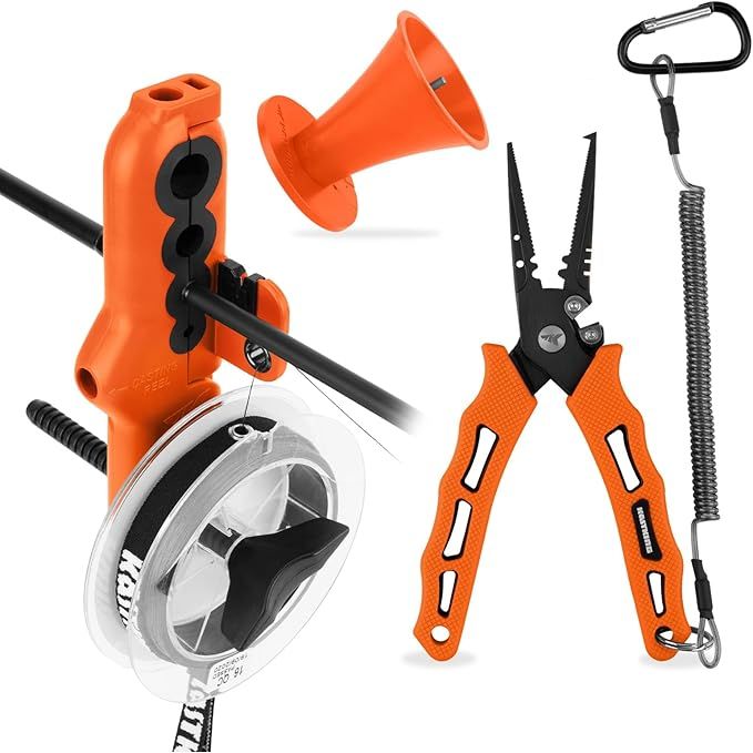 Introducing the KastKing Premium Fishing Tool Kit, featuring cutting-edge innovations designed to enhance your angling experience. At the heart of this kit is the patented spooling technology of the KastKing KutR, engineered for hassle-free operation on both spinning and baitcasting reels. Bid farewell to line twists as its rubber-coated clamp grips any rod size securely without causing damage. The KutR's adjustable tension bands ensure optimal line tension, making the spooling process more efficient. Crafted from robust ABS material, this tool promises lasting durability without the risk of rust.